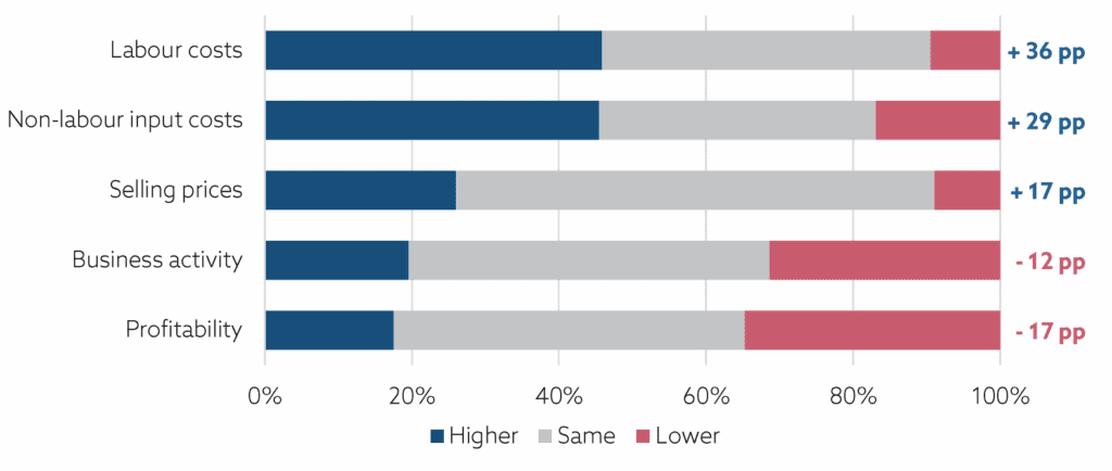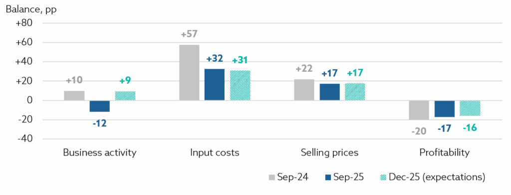 In September 2025, the all-sector business activity indicator was moderately negative (-12 percentage points [pp]). Close to half of businesses reported higher labour and input costs compared with three months ago.